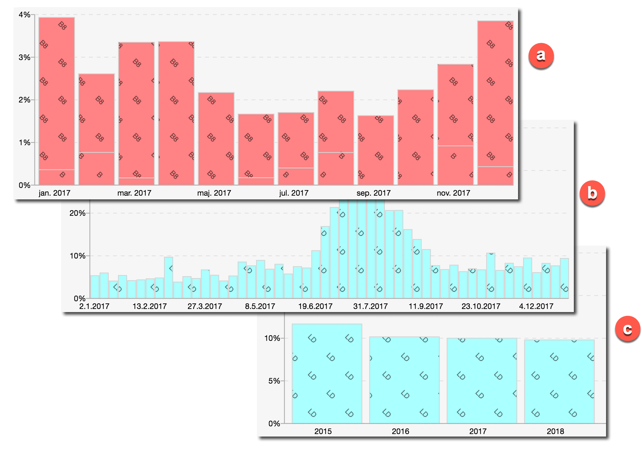 Časovni trendi posameznih odsotnosti za celotno organizacijo. a Delež bolniških odsotnosti napram celotni delovni obremenitvi zaposlenih po mesecih v letu. b Delež letnega dopusta po tednih v letu. c Delež letnega dopusta po letih za zadnjih nekaj let.