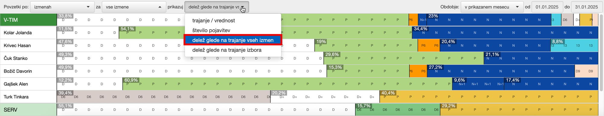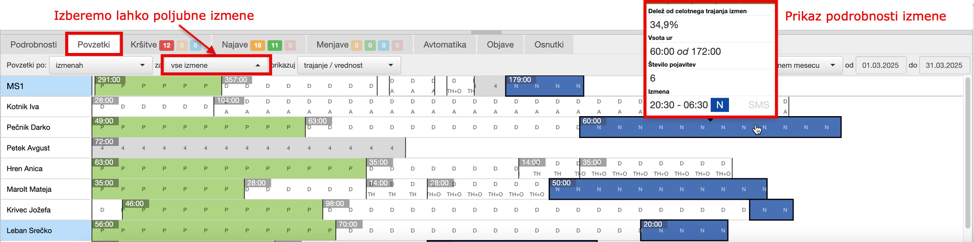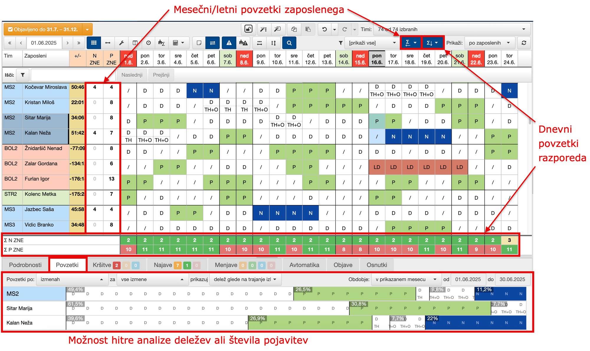 Dodatne možnosti hitre analize se nam odprejo v spodnjem razdelku, pod zavihkom Povzetki. Vsebina zavihka ustreza trenutno izbranim celicam v razporedu in prikazuje delež opravil oz. odsotnosti tako za celoten oddelek kot za izbrane zaposlene. S klikom na posamezen del grafikona se prikažejo še dodatne informacije o izmeni oz. odsotnosti. Povzetke lahko prikažete za poljubno časovno obdobje (npr. trenutni mesec, več mesecev, leto). Na voljo so povzetki o trajanju/vrednosti izmen (npr. kakšen delež nočnih izmen je opravil posamezni zaposleni), številu pojavitev posameznih izmen/odsotnosti (količina porabljenega letnega dopusta, študijskega dopusta, bolniških odsotnosti) pa tudi vsota posameznih plačnih dodatkov in drugih obračunskih kategorij.